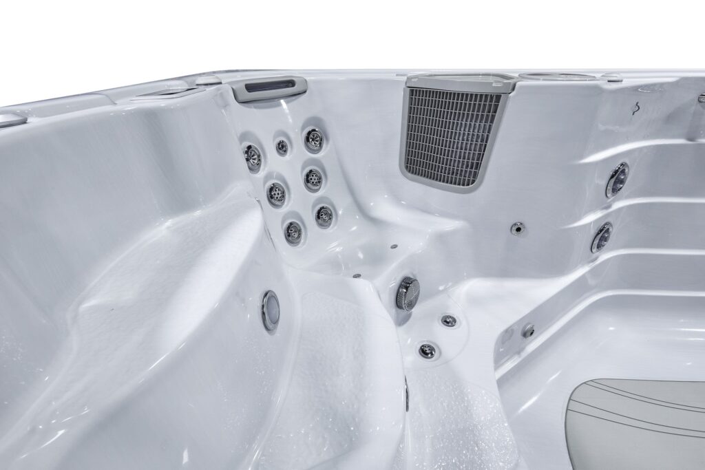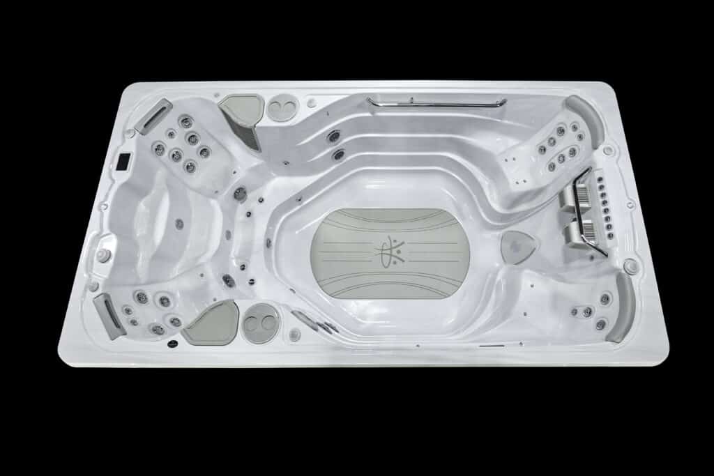 The 14AX AquaSport boasts a new ergonomic and swim tank design, along with numerous engineering innovations, including four Hydrotherapy Seats, each with Zone Therapy. The swim experience has reached a new level with a 53-inch deep swim tank, featuring two AccuFlo jets that provide a smooth swim, and one AquaStream jet, all supported by our new Dual Performance Flow Intakes that significantly reduce the reflective wave effect.