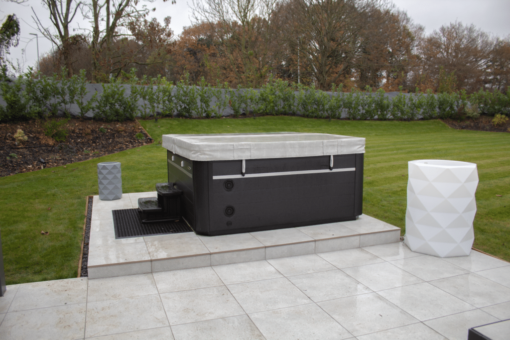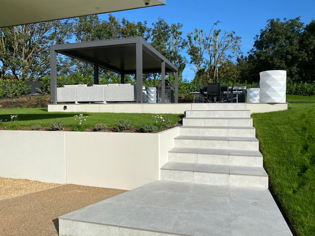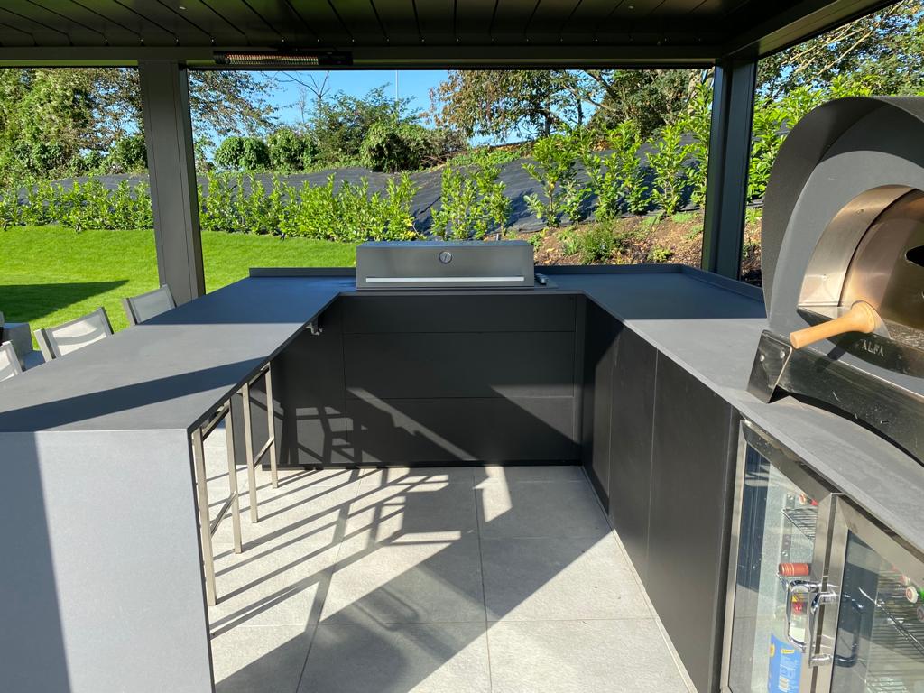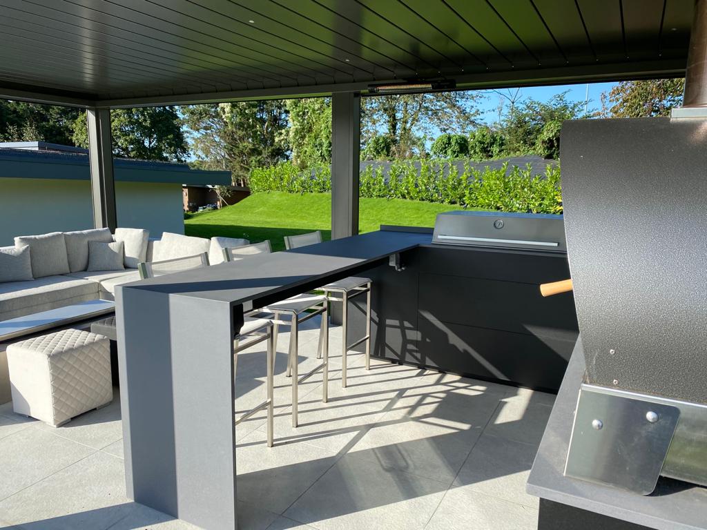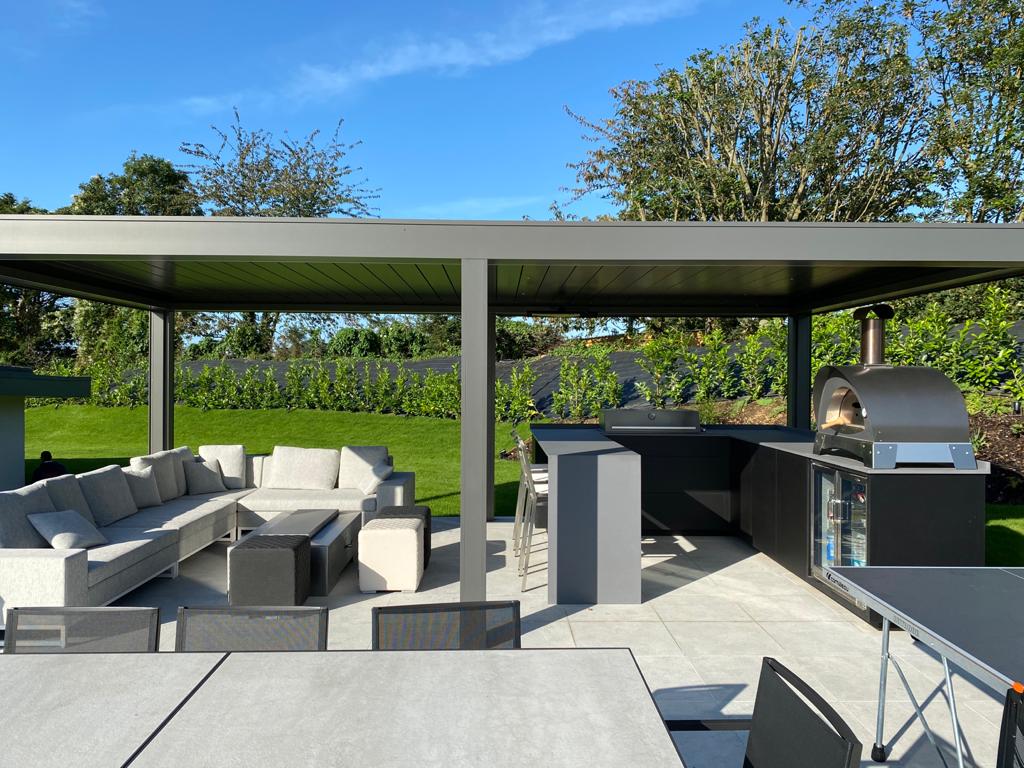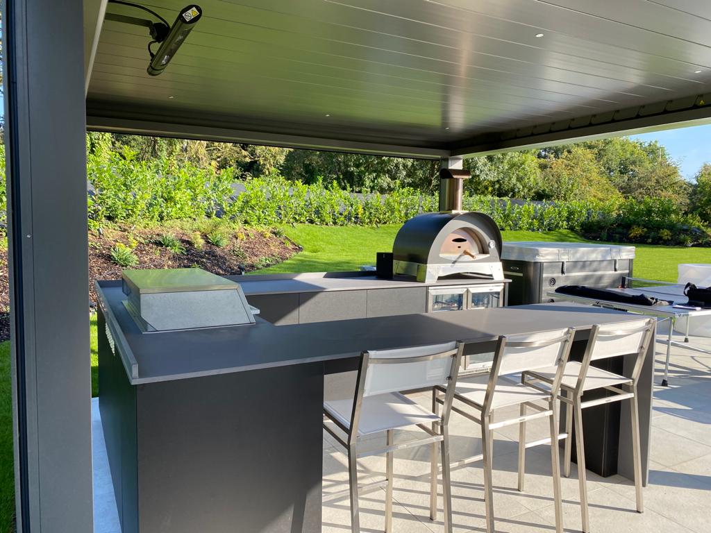 Transforming the customer’s garden into an oasis, this project features an U-shaped kitchen equipped with high-end appliances such as the Beefeater Proline grill, double fridge, and an Alfa Pizza Oven. Additionally, the kitchen boasts a bar/dining area complete with stools for added convenience. Across from the kitchen, we’ve crafted a cosy sitting area furnished with weatherproof furniture and a fire pit, all sheltered beneath a Pratic aluminum pergola. Completing the ensemble, a free-standing Hydropool hot tub is installed on the opposite side, inviting relaxation and rejuvenation amidst nature’s embrace.