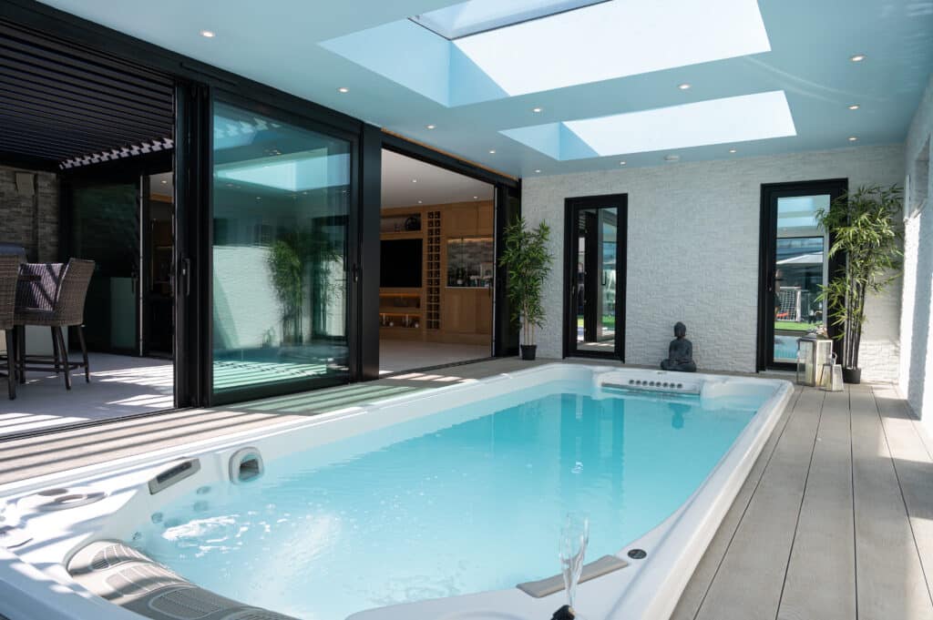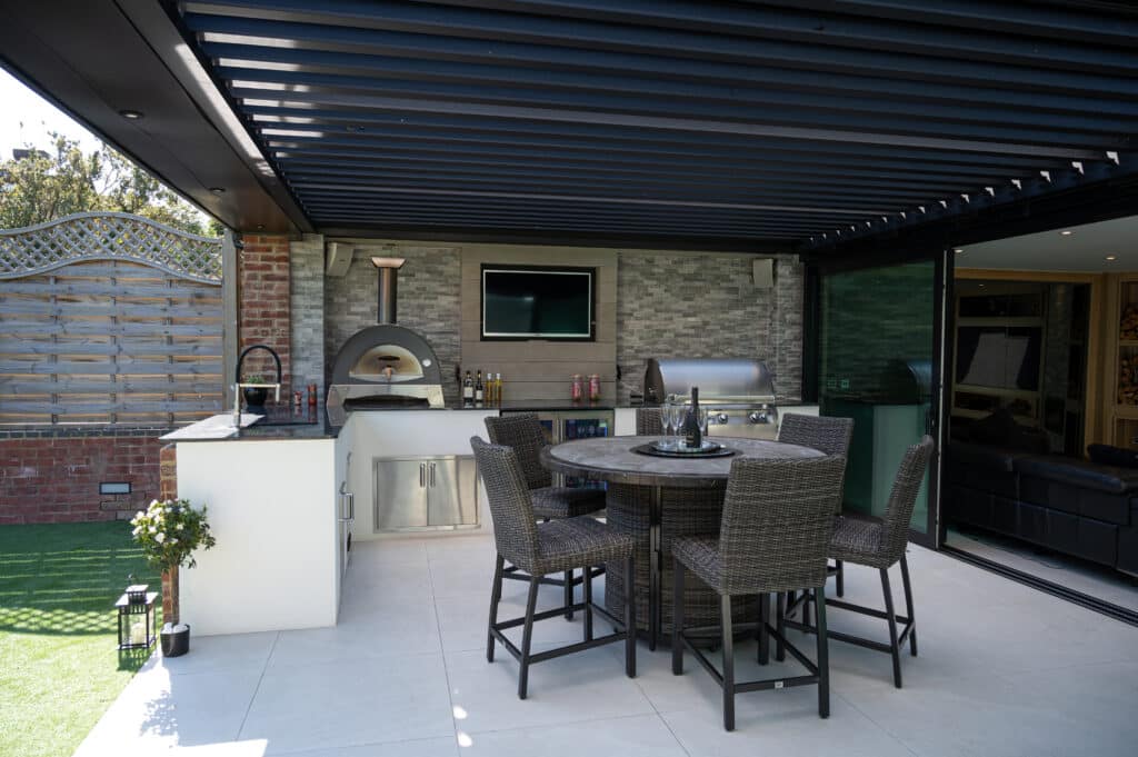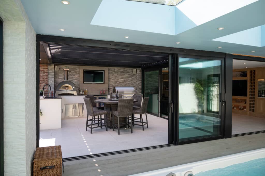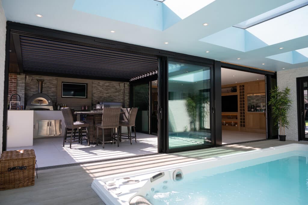 Exploring the details of this project, at the core of the outdoor area is a carefully crafted outdoor kitchen, featuring top-notch amenities such as a four-burner grill, an Alfa Pizza Oven, a Blastcool double fridge, and stainless steel drawers. Enhancing this culinary space is the self-cleaning swim spa, seamlessly integrated to blend indoor and outdoor living seamlessly. A standout feature is the Pratic aluminium pergola roof, elegantly positioned on the walls, adding sophistication while offering shelter and shade. With innovative design and expert craftsmanship, we’ve turned this outdoor space into a sanctuary for relaxation and culinary adventures, where every aspect merges to provide an exceptional experience.