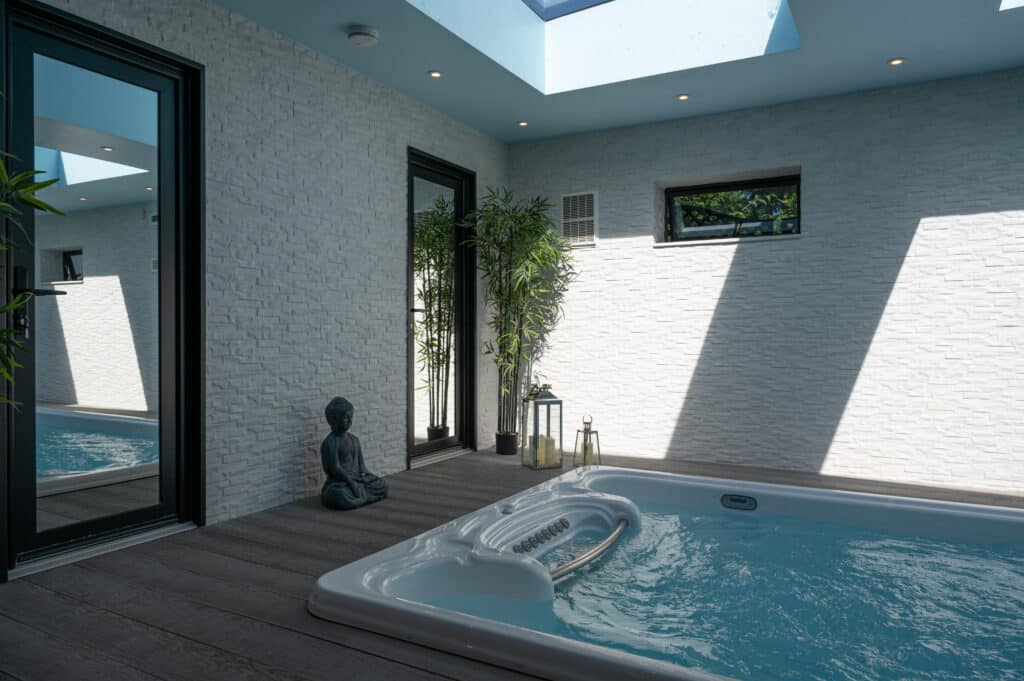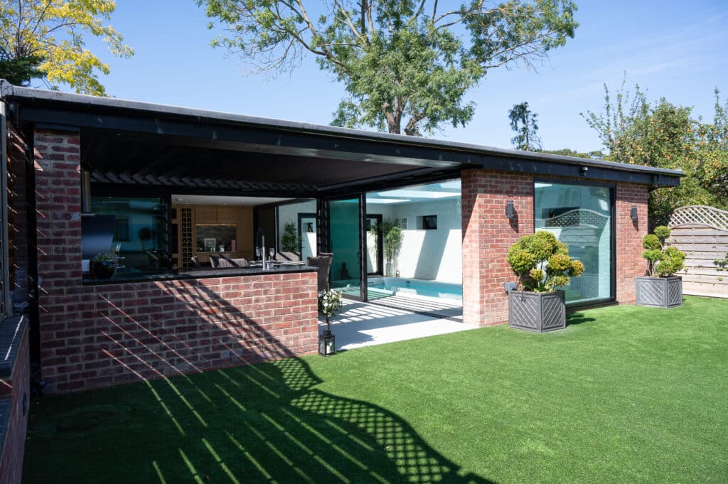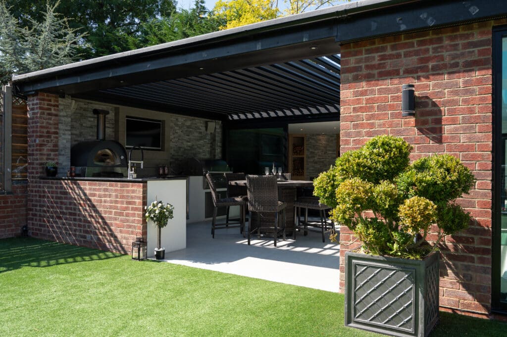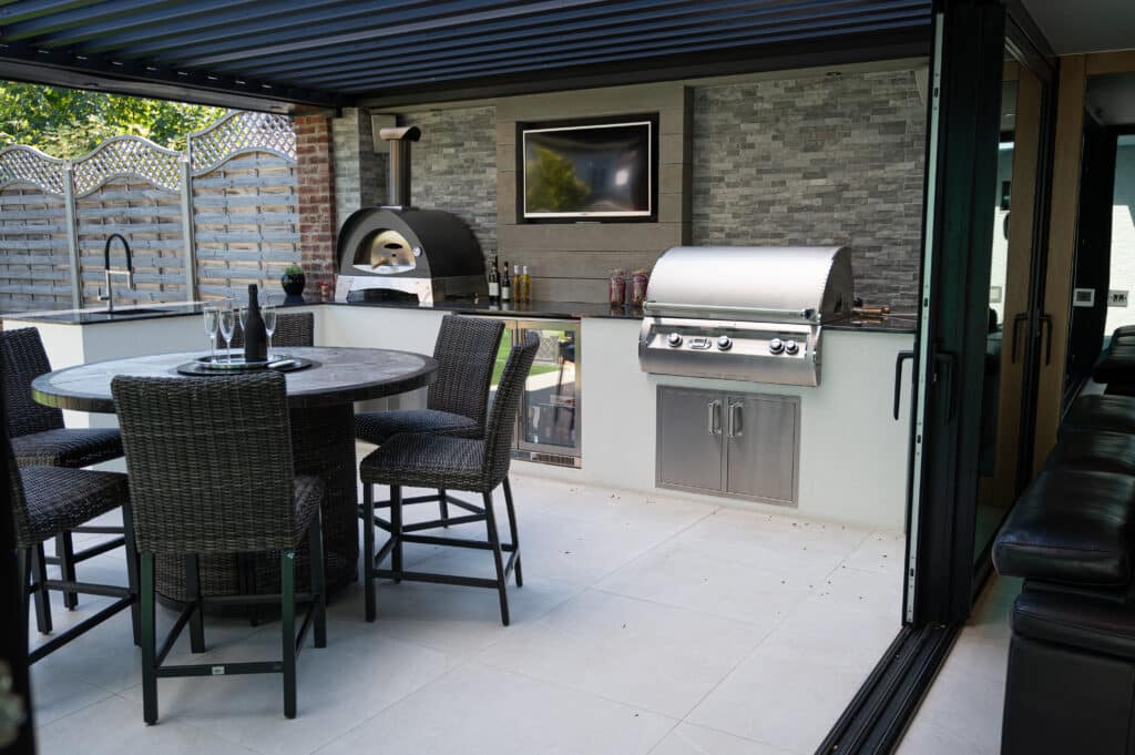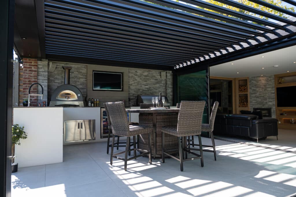 Exploring the details of this project, at the core of the outdoor area is a carefully crafted outdoor kitchen, featuring top-notch amenities such as a four-burner grill, an Alfa Pizza Oven, a Blastcool double fridge, and stainless steel drawers. Enhancing this culinary space is the self-cleaning swim spa, seamlessly integrated to blend indoor and outdoor living seamlessly. A standout feature is the Pratic aluminium pergola roof, elegantly positioned on the walls, adding sophistication while offering shelter and shade. With innovative design and expert craftsmanship, we’ve turned this outdoor space into a sanctuary for relaxation and culinary adventures, where every aspect merges to provide an exceptional experience.