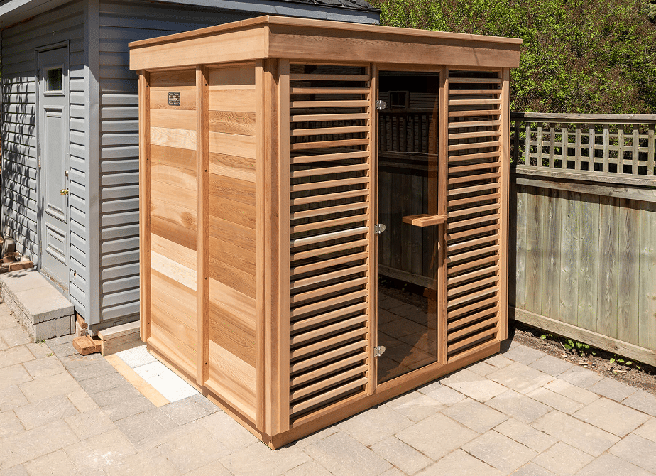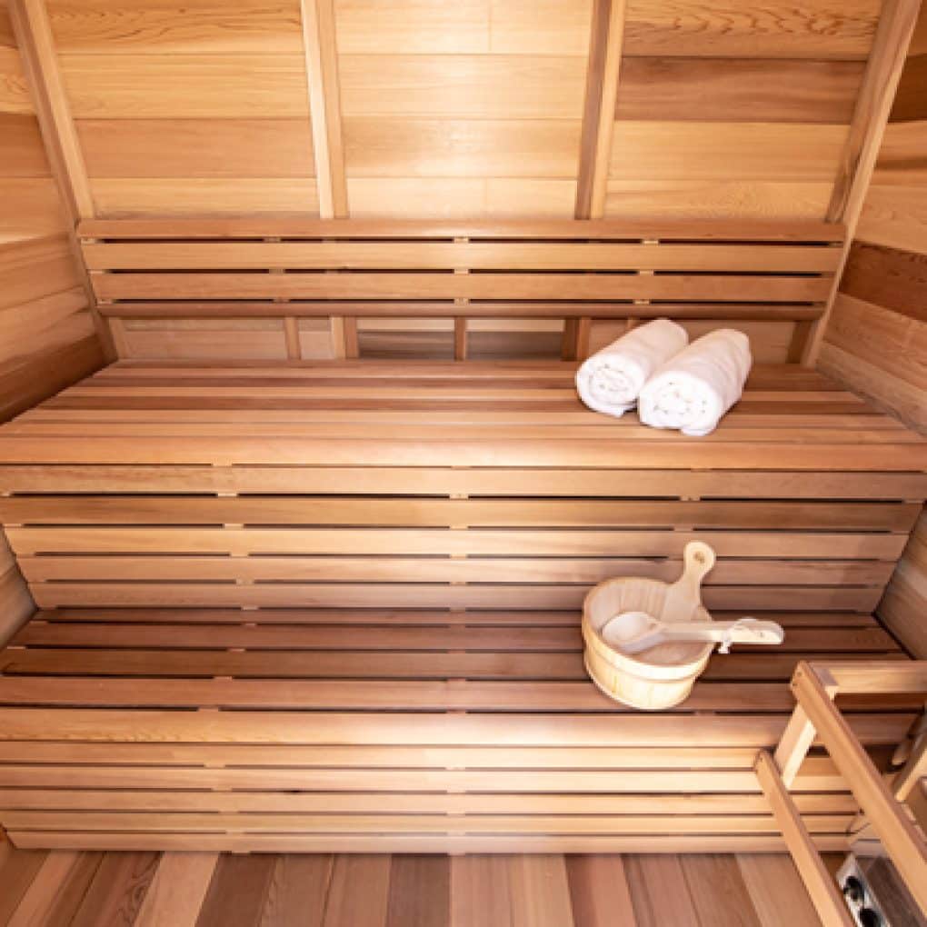 The Pure Cube CU570 outdoor sauna is a charming and compact model that is sure to captivate attention in any backyard setting. Highlighting a front wall adorned with tempered glass windows and a centrally positioned frameless door, this sauna exudes a refined finish. Noteworthy details include a red cedar door handle and stainless steel door hinges, adding to the overall aesthetic appeal. Enjoy the sauna’s versatility throughout every season, thanks to the remarkable insulating properties of red cedar and the inclusion of an ice and water shield in the sealing. Experience the superior craftsmanship that defines Leisurecraft, evident in every detail of the sauna.