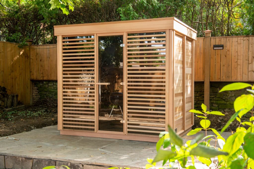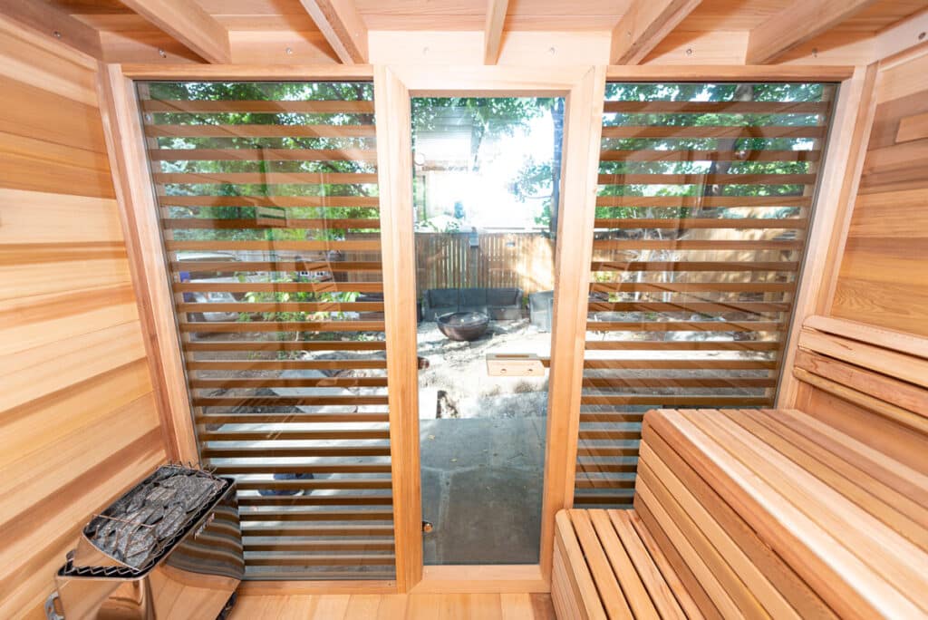 The Pure Cube CU670 Outdoor Sauna boasts a delightful and spacious design, highlighted by two large window panels on the front wall and a glass door. Cultivate a serene and relaxing ambiance with the option to incorporate semi-privacy panels, complete with a fixed cedar grill on the outside. Additionally, the Pure Cube CU670 Sauna includes a roof equipped with an ice and water shield, ensuring both durability and protection.
